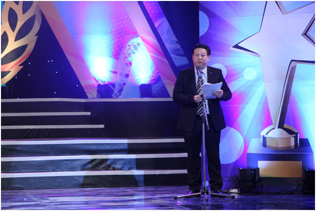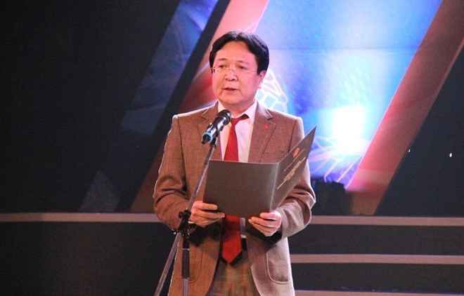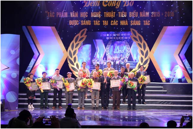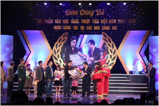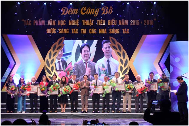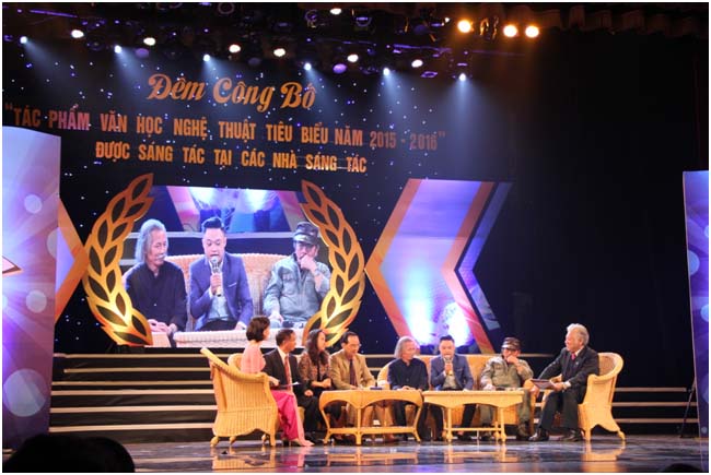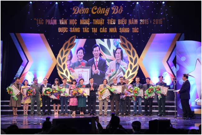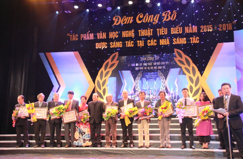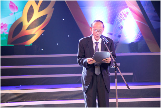 Ông Huỳnh Văn Ngàn, Giám đốc Trung tâm Hỗ trợ sáng tác văn học nghệ thuật đọc báo cáo tổng kết Trại sáng tác 2015 2016 tại Lễ công bố