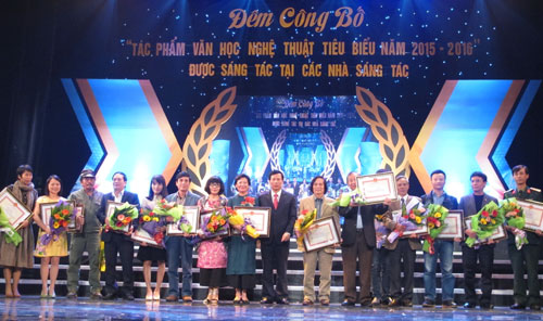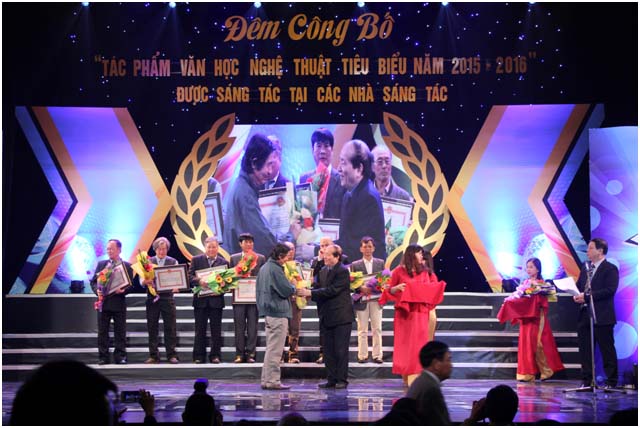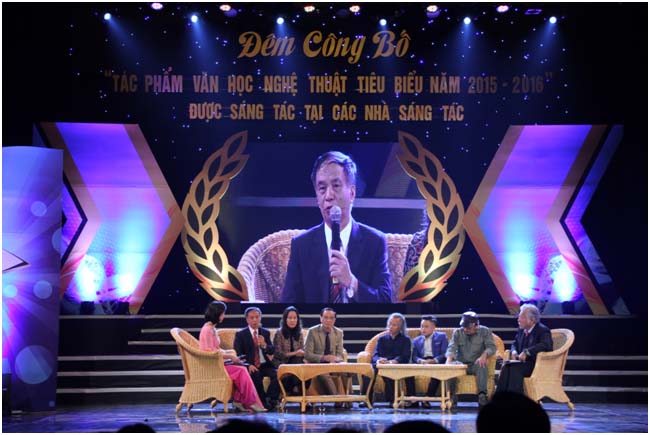 Ông Huỳnh Văn Ngàn, Giám đốc Trung tâm Hỗ trợ sáng tác văn học nghệ thuật đọc báo cáo tổng kết Trại sáng tác 2015 2016 tại Lễ công bố